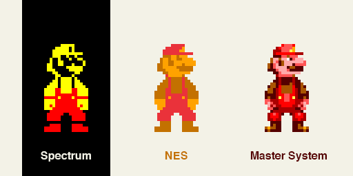 The Spectrum could handle two colours per 8×8 pixel tile from a set palette of 16 colours. The NES 3 colours per 16×16 pixel tile, from a bank of 4 unique palettes made up of 53 unique colours. The master system — the king of colours — had a restriction of a whopping 12 colours per sprite, from a 6-bit, 64 colour set palette.